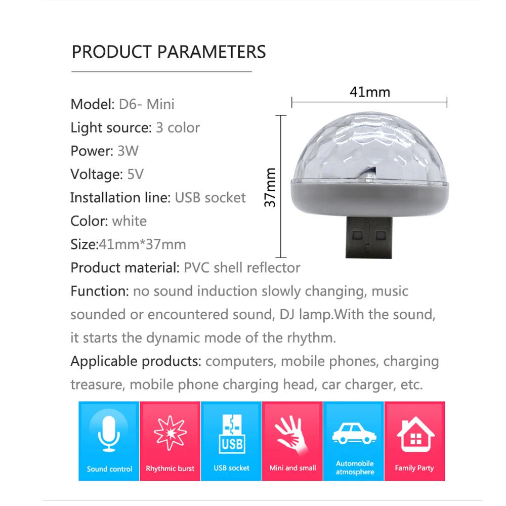 This stage light is designed for almost all mobile phones Automatic movement or voice control, cool scene feel Seven color strobe effects, color changes with music rhythm Made of high quality plastic case and clear crystal lampshade Create an exquisite, beautiful and stylish environment Suitable for car decoration, disco, ballroom, KTV, bar, stage, club, party, equipment with USB interface, etc. Environmental protection, power saving various colors and low temperatures easy to install, plug and play.