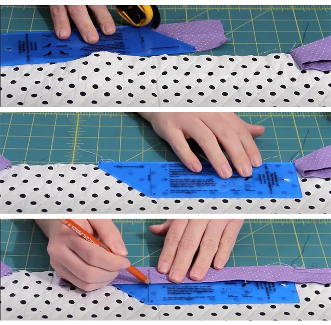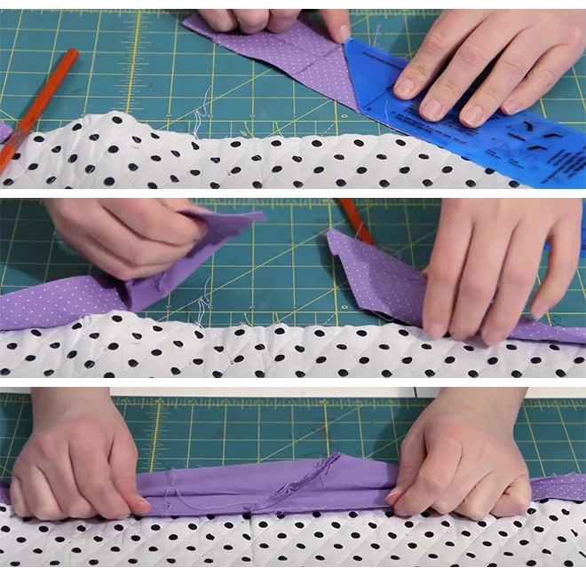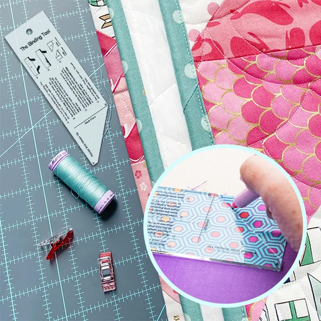 When you finish the last seam of the binding only an angle seam will work to reduce the bulk of this seam. The Binding Tool makes a perfect ending every time. Two measurements, two cuts and you're on your way to a great finish.