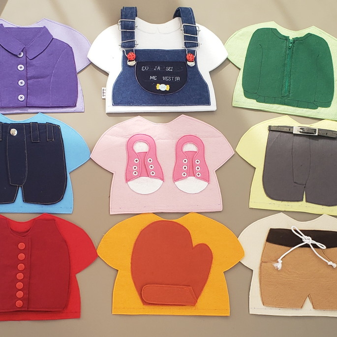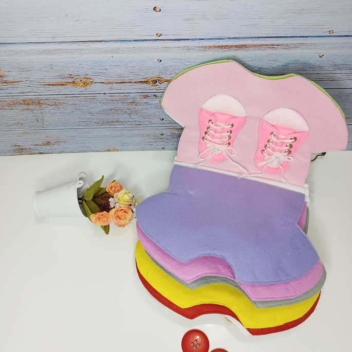 It has 7 pages, as well as the front and back cover, with clips that teach the child how to open and close various buttons, fasten belts, tie shoelaces, open and close zippers, open and close Velcro, tie ribbons.